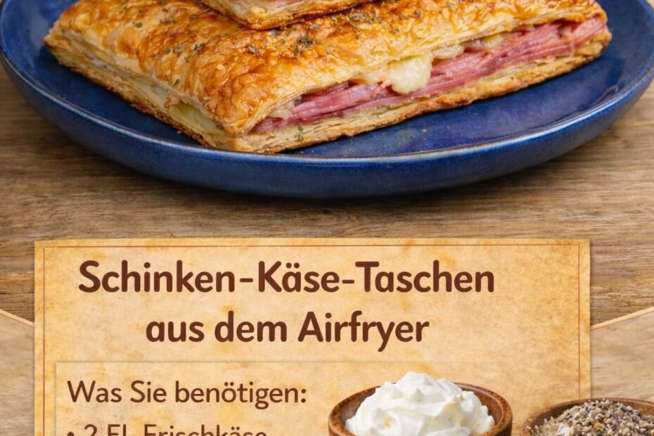 Zutaten (ca. 3 Portionen) 1 Rolle Blätterteig (rechteckig) 120–150 g Kochschinken 120 g Käse (z. B. Gouda oder Emmentaler) 2 EL Frischkäse 1 Ei (zum Bestreichen) Salz & Pfeffer optional: etwas Oregano oder Petersilie 👩🍳… Schinken-Käse-Taschen aus dem Airfryer