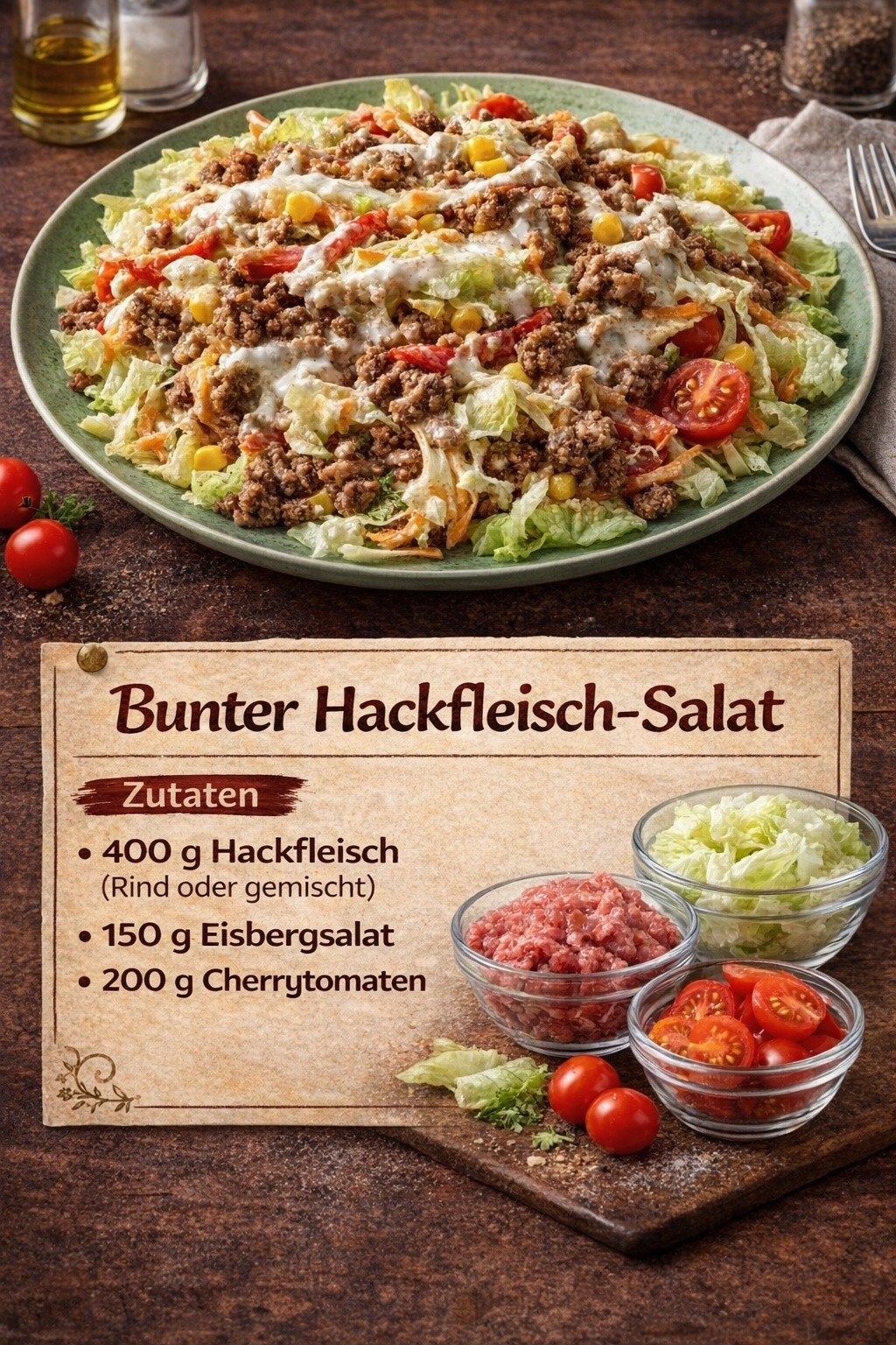 Dieser Hackfleisch-Salat überzeugt durch seine Vielseitigkeit und schnelle Zubereitung. Er ist sättigend, frisch und ideal für alle, die ein unkompliziertes, aber geschmackvolles Gericht suchen.