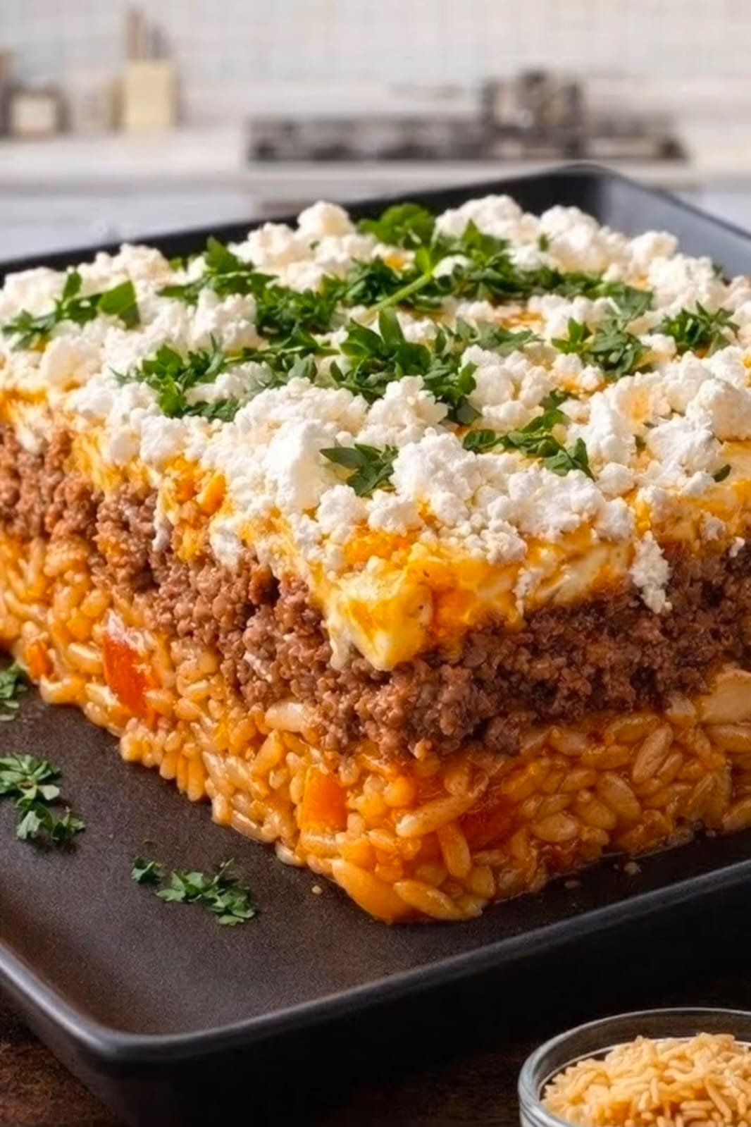 Dieser griechisch inspirierte Auflauf ist echtes Comfort Food: zartes Hackfleisch, würzige Tomatensauce, perfekt gegarte Kritharaki und oben drauf goldbrauner Feta – einfach unwiderstehlich!