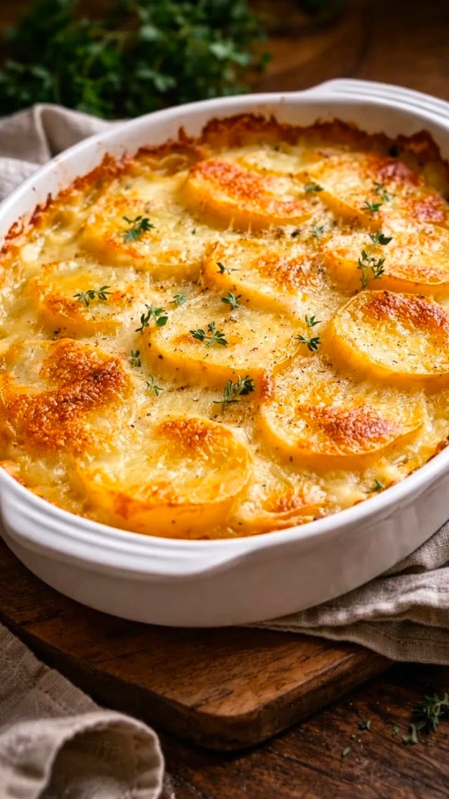 Das cremige Kartoffelgratin heiß servieren und genießen.