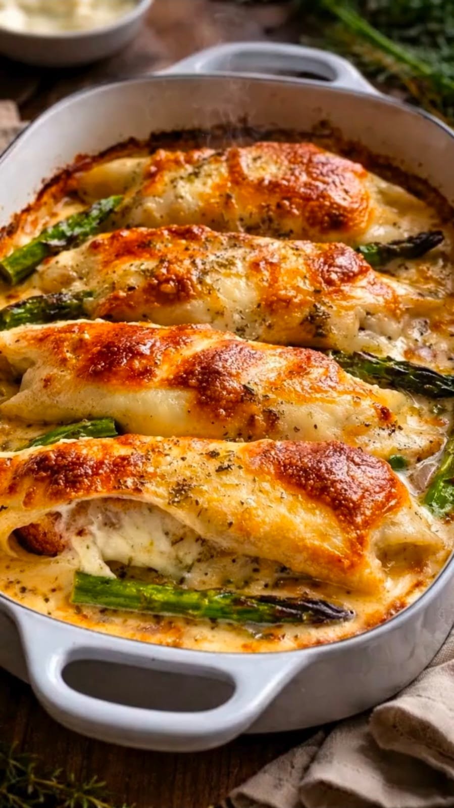 Dieses Gericht ist die perfekte Kombination aus leicht, cremig und aromatisch. Saftige Hähnchenbrust wird mit zart schmelzendem Mozzarella gefüllt und zusammen mit frischem Spargel zubereitet. Ideal für ein schnelles Mittagessen oder ein leichtes Abendessen – einfach gemacht, aber geschmacklich richtig stark.