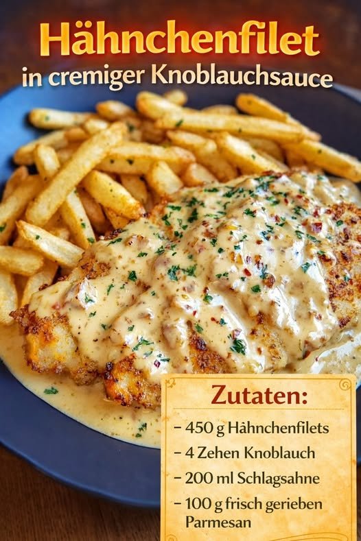 Saftige Hähnchenfilets treffen auf eine herrlich cremige Knoblauchsauce – ein einfaches, aber unglaublich leckeres Gericht für jeden Tag. Schnell zubereitet und perfekt kombinierbar mit vielen Beilagen.