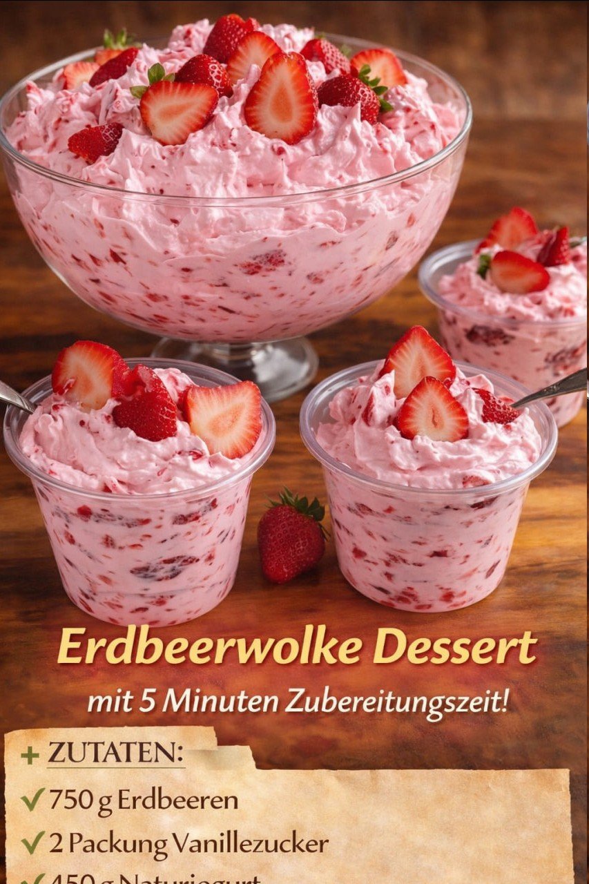 Wenn es draußen warm ist und man Lust auf etwas Leichtes, Frisches und dennoch Süßes hat, ist dieses Erdbeerwolken-Dessert genau das Richtige. Es vereint die natürliche Süße reifer Erdbeeren mit der angenehmen Frische von Joghurt und entsteht in nur wenigen Minuten – ganz ohne großen Aufwand.