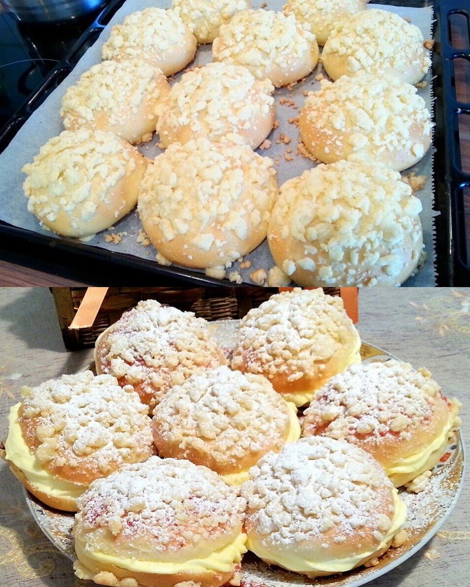 Diese gefüllten Streuseltaler sind eine schöne Mischung aus klassischem Hefeteiggebäck und cremigem Dessert. Obwohl das Rezept mehrere Schritte enthält, lohnt sich die Zubereitung – besonders wenn man Gäste erwartet oder etwas Besonderes zum Kaffee servieren möchte.